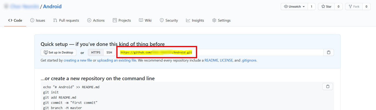 새로운 Repository를 생성했으면 저기 보이는 git 링크를 복사해줍니다 [Ctrl+C]