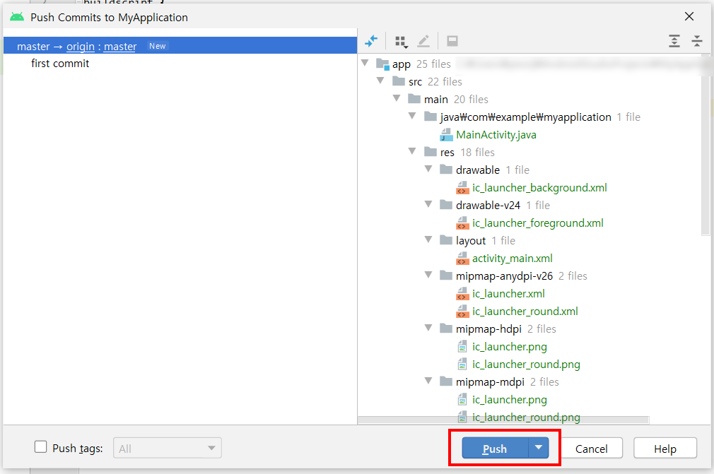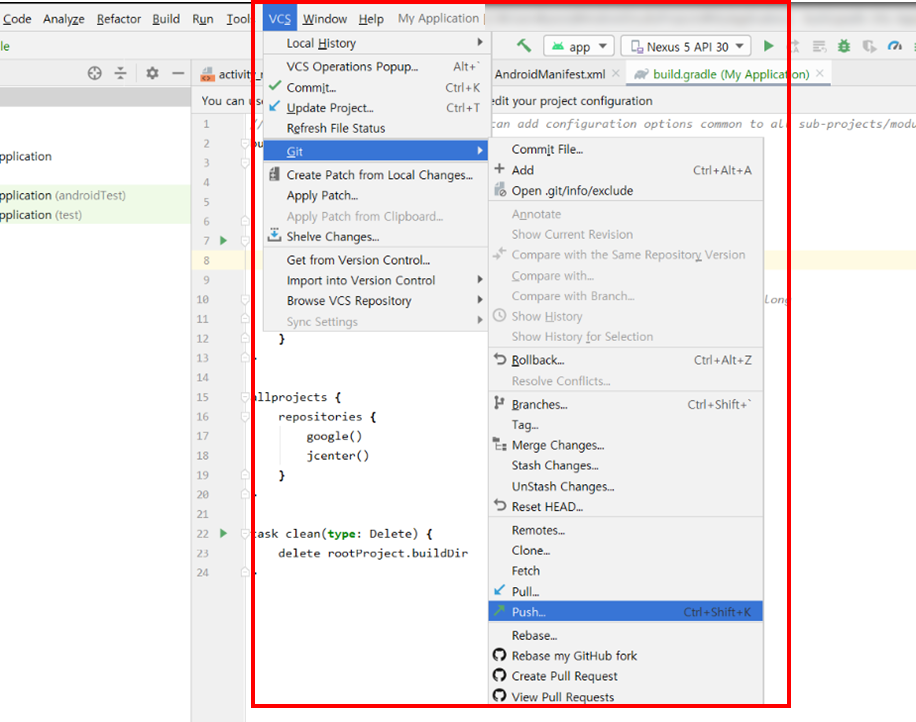 그럼 이제 마지막으로 Github에 Push 해주기 위해서 [VCS]->[Git]->[Push] 해줍니다