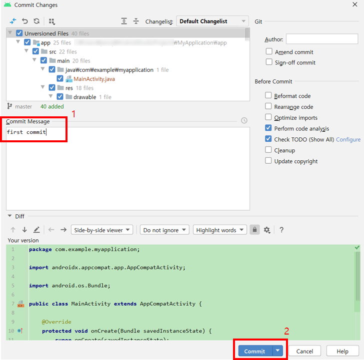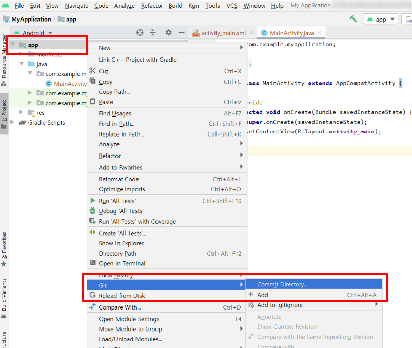 자신의 안드로이드 app수준에서 마우스 오른쪽 클릭 후 [Git] -> [Commit Directory]에 들어갑니다.