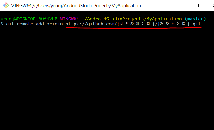 그 후 git remote add origin https://github.com/{사용자아이디}/{저장소이름}.git 을 작성해줍니다