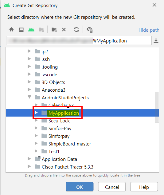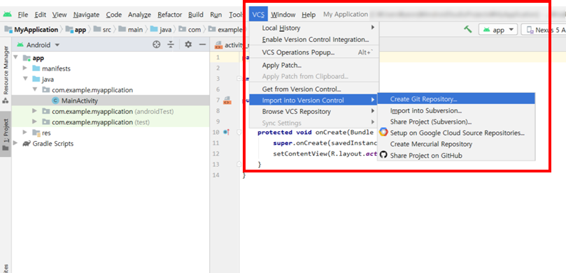 [VCS]->[Improt into Version Control] ->[Create Git Repository]에 들어가서