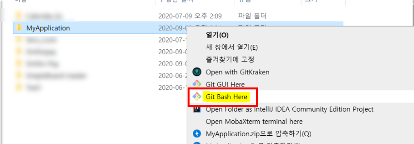 Android프로젝트 폴더에 들어가서 마우스 오른쪽 클릭 -> [Git Bash Here]에 들어갑니다.