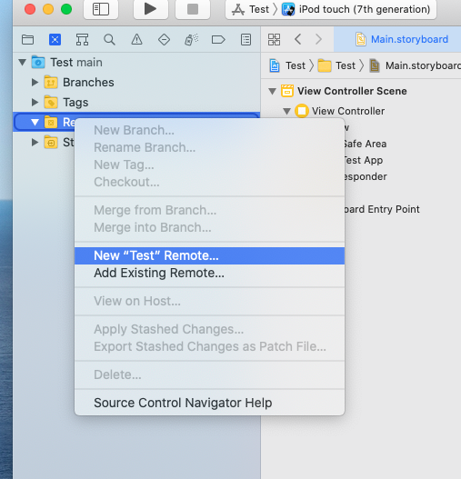 4. 왼쪽에 파일을 볼 수 있는 공간에서 두 번째 탭을 클릭하여 FileName -> Remotes 오른쪽 클릭(ctl + 클릭) -> new "Test" Remotes..