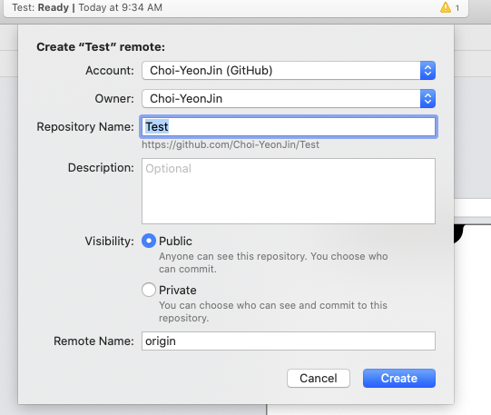 위의 게시글을 보면 파일을 생성할 때 Create Git repository on my Mac이라는 체크박스에 표시하면 Github연동이 쉽고 빠르다고 설명드렸습니다.
